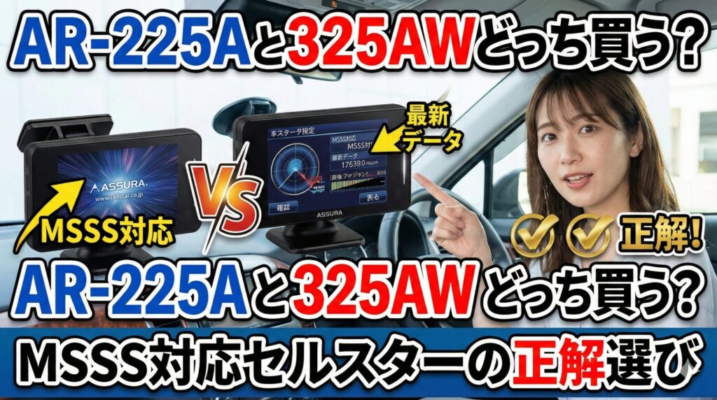 セルスターから発売されている最新のセーフティレーダー、「AR-225A」と「AR-325AW」。 どちらもMSSS(移動式オービス)対応の高性能モデルとして注目されていますが、外見もスペックも似ており、「結局どっちを買えばいいの?」と迷っている方は多いはず...
